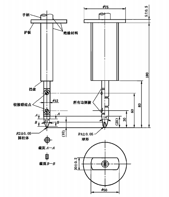在進行附加字母B的試驗時,鉸接試指可進人外殼80 mm的長度,但擋盤($50 mmX20 mm)不得
